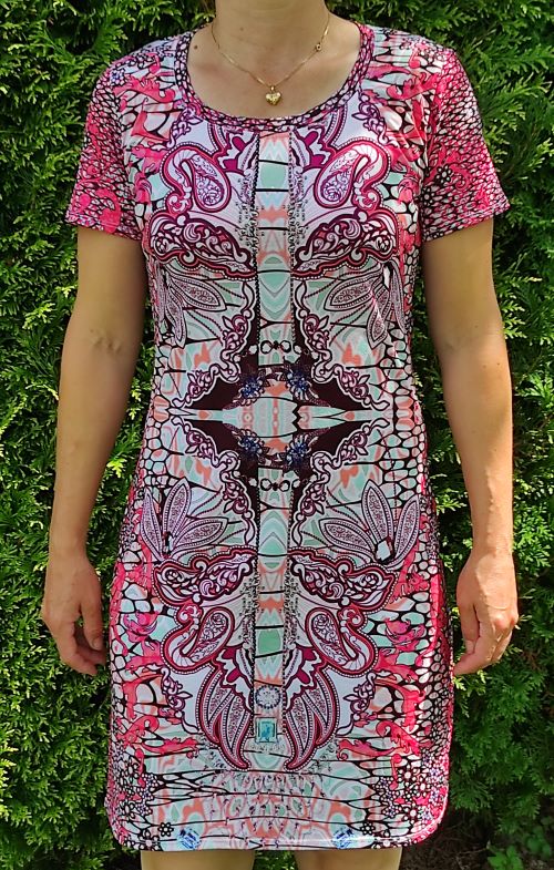 Dámské šaty nad kolena, česká výroba, šité na zakázku pro můj obchod. Jemně kulatý výstřih. Přiléhavý střih. Přední část je v mozaikovém vzoru, což dodává šatům exkluzivní vzhled. Velmi příjemný materiál a poutavý design.