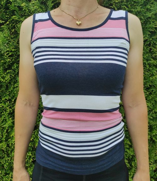 Dámské tílko české výroby Scharf. Velmi příjemné na omak, měkké, Kombinace tmavě modré, růžové a bílé.