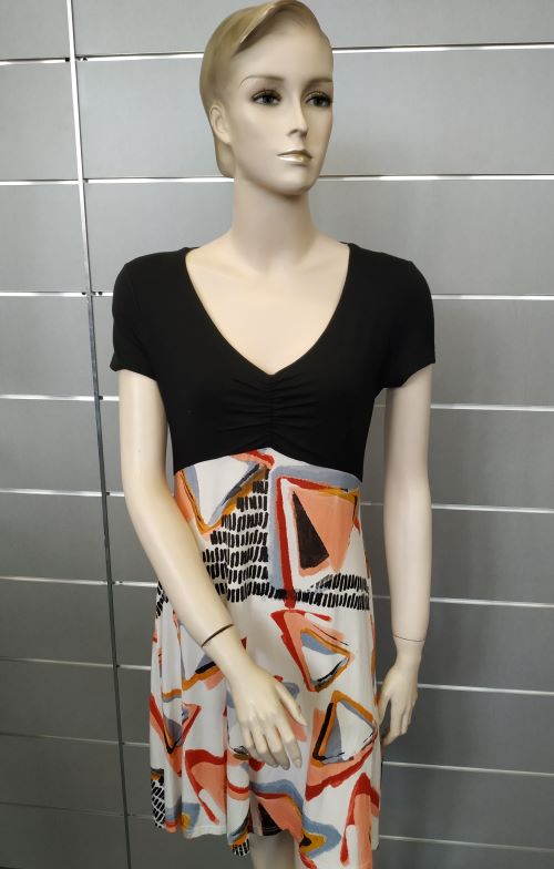 Lehké stylové dámské šaty italské značky Smash. Krátký rukáv, u prsou mírně nařasené, od prsou dolů se rozšiřují- střih tvaru A. Velmi příjemný a měkký materiál.