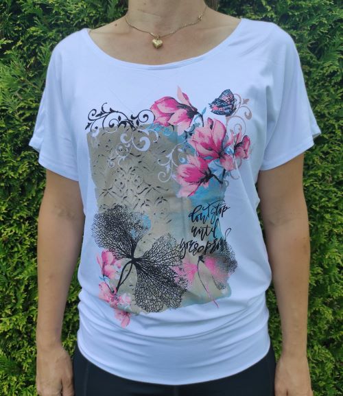 Velmi přijemná na omak, lehká, pružná, chladivá. Na přední části potisk, zadní část celá bílá.